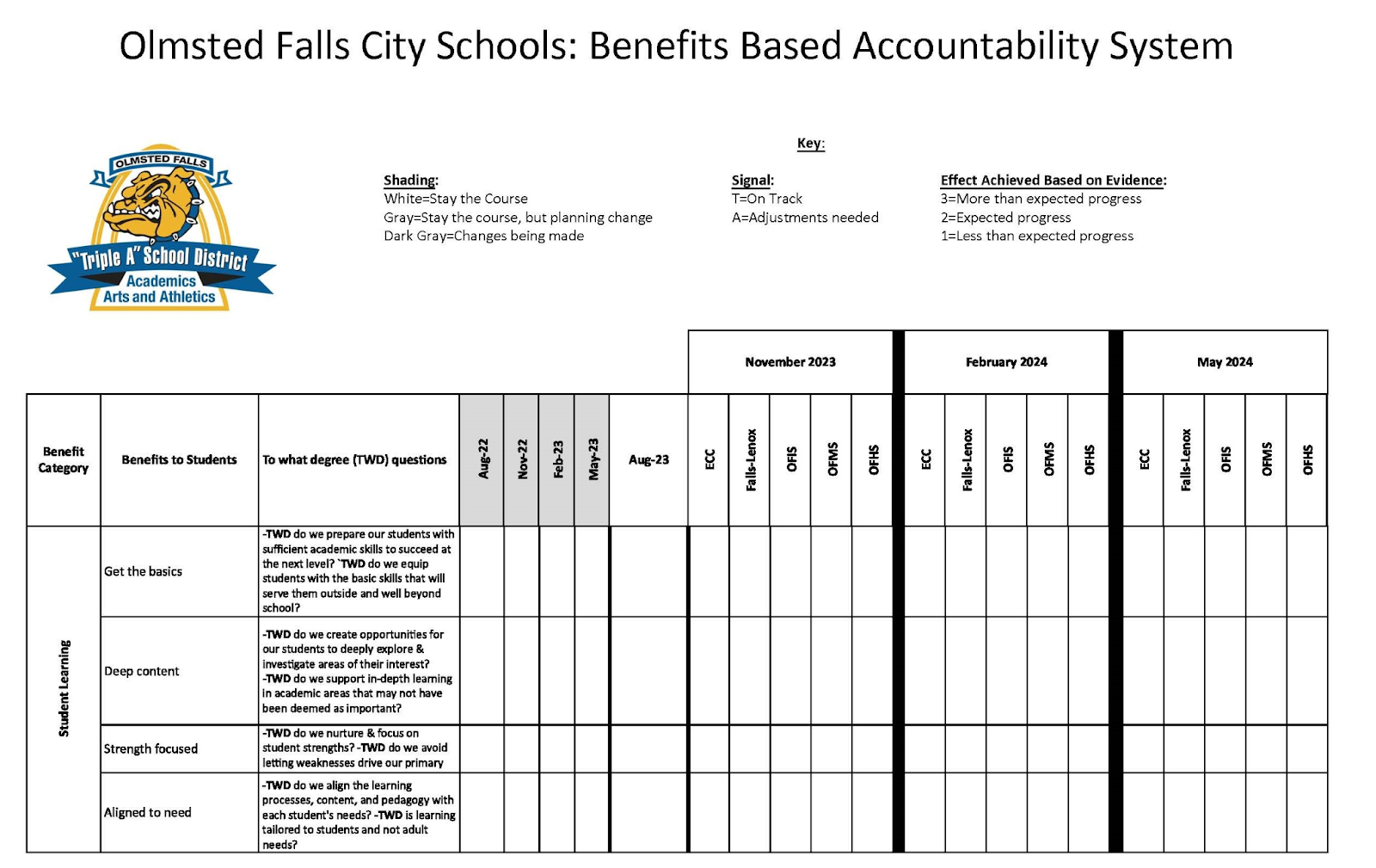 We plan to launch our benefits-based accountability system this fall and will provide our first progress report in November. We will provide additional updates in February and May. While we will be required to continue to live within the test-based model our state requires, our community can expect to see reporting on the benefits that each school will select from 7 main categories: Student Learning, Student Readiness; Student Engagement and Well-Roundedness, Student Well-Being, the Effectiveness of our Staff, Community Connections and an Effective System. In totality there are about 31 benefits that fall within each of the 7 categories.